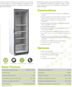Armario expositor refrigerado. Diseñado para bebidas y productos envasados. Puerta de vidrio de doble acristalamiento Climalit 4/18/4. Bastidor de plástico en color negro y tirador embutido. Exterior en acero plastificado e interior en poliestireno termoconformado con guías embutidas. Estantes regulables en altura que proporciona una gran versatilidad para guardar todo tipo de productos. Rango de temperatura de 2 a 6ºC. Iluminación interna vertical mediante luz LED para la perfecta visualización del producto en cada estante. Aislamiento en poliuretano inyectado con densidad de 40Kg/m3. Compresor hermético de alto par de arranque. Evaporador ventilado impreso en placa de aluminio. Condensador ventilado libre de mantenimiento. Clase climática 4. Refrigerante ecológico R600A. Control de temperatura mediante termostato analógico con visor digital. Tirador embutido en el marco situado en la parte izquierda (apertura a derecha). Capacidad latas 33cl: 518 unidades.