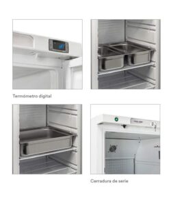 - Cuatro estantes ajustables y un fijo GN 2/1 y cerradura en dotación.