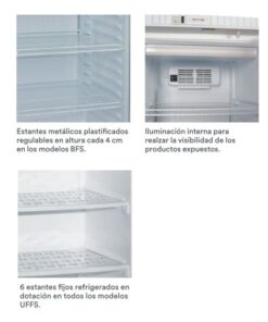 - Armario expositor de conservación, con marco de puerta en plástico y maneta integrada en el lateral.