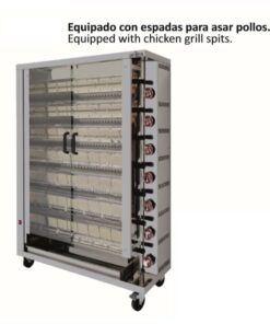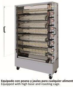 - Asador de pollos, preparado para equipar con espadas (no incluidas) para asar pollos y jaulas (no incluidas) para asar cualquier alimento.