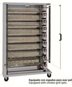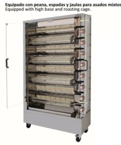 - Asador de pollos, preparado para equipar con espadas (no incluidas) para asar pollos y jaulas (no incluidas) para asar cualquier alimento.