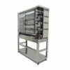 Asador de pollos a gas fabricado en acero inoxidable. Transmisión mecánica a cadena y engranajes de gran calidad. Motor de gran rendimiento instalado fuera de la fuente de calor. Quemadores independientes de gran poder calorífico con termopar de seguridad. Grifos independientes regulables máximo/mínimo con mandos de baquelita de gran calidad y apartados de la fuente de calor. Chapa entre quemadores desmontable. Bandeja inferior de acero inoxidable de gran capacidad para la recogida de aceites y grasas. Puertas de cristal templado. De serie se suministran predispuestos para gas propano – butano y se proporcionan inyectores para cambios a gas natural.
