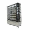 Asador de pollos a gas fabricado en acero inoxidable. Transmisión mecánica a cadena y engranajes de gran calidad. Motor de gran rendimiento instalado fuera de la fuente de calor. Quemadores independientes de gran poder calorífico con termopar de seguridad. Grifos independientes regulables máximo/mínimo con mandos de baquelita de gran calidad y apartados de la fuente de calor. Chapa entre quemadores desmontable. Bandeja inferior de acero inoxidable de gran capacidad para la recogida de aceites y grasas. Puertas de cristal templado. Dotado de serie con una base de acero inoxidable con 4 ruedas de gran resistencia, des de ellas con freno. De serie se suministran predispuestos para gas propano – butano y se proporcionan inyectores para cambios a gas natural.