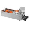 - Función asador doble automático: puede cargar la máquina de pollos y parar el bombo con dos espadas frente al quemador, así cocinará media hornada y precocinará la otra media. Una vez cocidos los pollos de delante, solo deberá pulsar un interruptor para que los pollos hechos le queden a mano y los precocinados pasen delante del fuego.