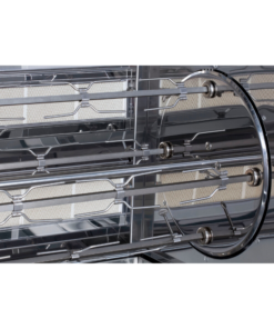 - Función asador simple: puede cargar de pollos solamente dos barras de cada bombo y pararlas frente al fuego, de esta manera el asado será como en una máquina eko simple. Está diseñada para que una vez paradas las barras frente a los quemadores tengan la misma distancia que una máquina simple.