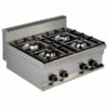 Cocina a gas con estructura y carrocería en acero inoxidable. Plano de trabajo, paneles laterales, paneles de mandos, chimeneas y puerta de horno en acero inoxidable AISI-304. Bandejas recogegrasas en acero inoxidable. Quemadores equipados con válvula de seguridad, termopar y llama piloto. Parrillas robustas de hierro fundido. Bandejas recogegrasas que cubren todo el área de cocción. Patas en acero inoxidable regulables en altura. Hornos de quemador tubular con válvula de seguridad, termopar y termostato. Parrillas de horno esmaltadas con guías en acero inoxidable. Tirador de la puerta del horno ergonómico y robusto, construido en acero inoxidable AISI-304. Capacidad de horno de 4 bandejas GN1/1. Armario lateral según modelos. Se suministran predispuestas para gas natural y se proporcionan inyectores para cambios a gas propano – butano.