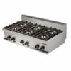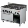 Cocina a gas con estructura y carrocería en acero inoxidable. Plano de trabajo, paneles laterales, paneles de mandos, chimeneas y puerta de horno en acero inoxidable AISI-304. Bandejas recogegrasas en acero inoxidable. Quemadores equipados con válvula de seguridad, termopar y llama piloto. Parrillas robustas de hierro fundido. Bandejas recogegrasas que cubren todo el área de cocción. Patas en acero inoxidable regulables en altura. Hornos de quemador tubular con válvula de seguridad, termopar y termostato. Parrillas de horno esmaltadas con guías en acero inoxidable. Tirador de la puerta del horno ergonómico y robusto, construido en acero inoxidable AISI-304. Capacidad de horno de 4 bandejas GN1/1. Armario lateral según modelos. Se suministran predispuestas para gas natural y se proporcionan inyectores para cambios a gas propano – butano.