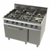 Modelo FO9C401VT. Cocina a gas con horno GN2/1 de 9Kw y 4 fuegos de 4,3+8,3+10+8,3Kw. Total 39,9Kw. Con válvula termostática. Medidas: 90 x 80 x 90 cm.