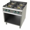 Cocina a gas con estructura construida en acero inoxidable. Plano de trabajo, paneles laterales, paneles de mandos, chimeneas y puerta de horno en acero inoxidable AISI-304. Bandeja recogegrasas en acero inoxidable que cubre todo el área de cocción. Quemadores de doble corona en latón, totalmente equipados con termopar de seguridad, sin llama piloto. Parrillas robustas de hierro fundido. Patas en acero inoxidable regulables en altura. Armario lateral según modelos. De serie se suministran predispuestas para gas propano – butano y se proporcionan inyectores para cambios a gas natural. Horno de quemador tubular con interior esmaltado y aislado térmicamente con lana de vidrio para ahorrar energía. Horno con válvula termostática en modelos VT. Parrillas de horno esmaltadas con guías en acero inoxidable. Tirador de la puerta del horno ergonómico y robusto construido en acero inoxidable AISI-304. Medidas interiores del horno: 506x662x375mm. Capacidad horno de 6 bandejas GN1/1 o 3 bandejas GN2/1 40mm de altura.