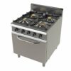Cocina a gas con estructura construida en acero inoxidable. Plano de trabajo, paneles laterales, paneles de mandos, chimeneas y puerta de horno en acero inoxidable AISI-304. Bandeja recogegrasas en acero inoxidable que cubre todo el área de cocción. Quemadores de alta potencia en latón, totalmente equipados con termopar de seguridad y llama piloto. Parrillas robustas de hierro fundido. Patas en acero inoxidable regulables en altura. Armario lateral según modelos. De serie se suministran predispuestas para gas propano – butano y se proporcionan inyectores para cambios a gas natural. Horno de quemador tubular con interior esmaltado y aislado térmicamente con lana de vidrio para ahorrar energía. Horno con válvula termostática en modelos VT. Parrillas de horno esmaltadas con guías en acero inoxidable. Tirador de la puerta del horno ergonómico y robusto construido en acero inoxidable AISI-304. Medidas interiores del horno: 506x662x375mm. Capacidad horno de 6 bandejas GN1/1 o 3 bandejas GN2/1 40mm de altura.