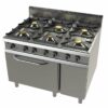 Cocina a gas con estructura construida en acero inoxidable. Plano de trabajo, paneles laterales, paneles de mandos, chimeneas y puerta de horno en acero inoxidable AISI-304. Bandeja recogegrasas en acero inoxidable que cubre todo el área de cocción. Quemadores de doble corona en latón, totalmente equipados con termopar de seguridad, sin llama piloto. Parrillas robustas de hierro fundido. Patas en acero inoxidable regulables en altura. Armario lateral según modelos. De serie se suministran predispuestas para gas propano – butano y se proporcionan inyectores para cambios a gas natural. Horno de quemador tubular con interior esmaltado y aislado térmicamente con lana de vidrio para ahorrar energía. Horno con válvula termostática en modelos VT. Parrillas de horno esmaltadas con guías en acero inoxidable. Tirador de la puerta del horno ergonómico y robusto construido en acero inoxidable AISI-304. Medidas interiores del horno: 506x662x375mm. Capacidad horno de 6 bandejas GN1/1 o 3 bandejas GN2/1 40mm de altura.