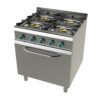 Cocina a gas con estructura construida en acero inoxidable. Plano de trabajo, paneles laterales, paneles de mandos, chimeneas y puerta de horno en acero inoxidable AISI-304. Bandeja recogegrasas en acero inoxidable que cubre todo el área de cocción. Quemadores de doble corona en latón, totalmente equipados con termopar de seguridad, sin llama piloto. Parrillas robustas de hierro fundido. Patas en acero inoxidable regulables en altura. Armario lateral según modelos. De serie se suministran predispuestas para gas propano – butano y se proporcionan inyectores para cambios a gas natural.