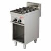 Cocina a gas con estructura y carrocería en acero inoxidable. Plano de trabajo, paneles laterales, paneles de mandos, chimeneas y puerta de horno en acero inoxidable AISI-304. Bandejas recogegrasas en acero inoxidable. Quemadores equipados con válvula de seguridad, termopar y llama piloto. Parrillas robustas de hierro fundido. Bandejas recogegrasas que cubren todo el área de cocción. Patas en acero inoxidable regulables en altura. Hornos de quemador tubular con válvula de seguridad, termopar y termostato. Parrillas de horno esmaltadas con guías en acero inoxidable. Tirador de la puerta del horno ergonómico y robusto, construido en acero inoxidable AISI-304. Capacidad de horno de 4 bandejas GN1/1. Armario lateral según modelos. Se suministran predispuestas para gas natural y se proporcionan inyectores para cambios a gas propano – butano.