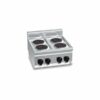 Cocina diseñada en acero inoxidable AISI 304. Sobre y frontal de apoyo en acero inoxidable de 1.5mm de espesor. Mandos en fibra de vidrio resistentes al calor, con protección antigrasa. Placas redondas de 300mm en fundición de alto rendimiento térmico, herméticamente fijados a la base monobloc en una sola pieza. Resistencias blindadas en acero inoxidable incoloy de 2,6kw. Mando con 7 posiciones, con termostato de trabajo y de seguridad. Lámparas testigo de control y funcionamiento. Modelo con horno eléctrico GN 1/1. Patas de acero inoxidable con altura regulable en 50mm.
