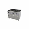 Cocina diseñada en acero inoxidable. Plano de trabajo, paneles laterales, paneles de mandos, chimeneas y puerta de horno en acero inoxidable AISI-304. Bandejas recogegrasas en acero inoxidable, que cubren todo el área de cocción. Quemadores alta potencia de doble corona en latón, equipados con termopar de seguridad. Parrillas robustas de hierro fundido. Patas en acero inoxidable regulables en altura. Hornos de quemador tubular con interior esmaltado y aislado térmicamente con lana para ahorrar energía. Hornos sin válvula termostática. Grill de horno a gas. Parrillas de horno esmaltadas con guías de acero inoxidable. Tirador de la puerta del horno ergonómico y robusto construido en acero inoxidable AISI-304. Capacidad horno de 3 bandejas GN1/1 de 40mm de altura. De serie se suministran predispuestas para gas propano-butano y se proporcionan inyectores para cambios a gas natural.
