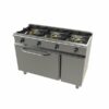 Cocina diseñada en acero inoxidable. Plano de trabajo, paneles laterales, paneles de mandos, chimeneas y puerta de horno en acero inoxidable AISI-304. Bandejas recogegrasas en acero inoxidable, que cubren todo el área de cocción. Quemadores alta potencia de doble corona en latón, equipados con termopar de seguridad. Parrillas robustas de hierro fundido. Patas en acero inoxidable regulables en altura. Hornos de quemador tubular con interior esmaltado y aislado térmicamente con lana para ahorrar energía. Hornos sin válvula termostática. Grill de horno a gas. Parrillas de horno esmaltadas con guías de acero inoxidable. Tirador de la puerta del horno ergonómico y robusto construido en acero inoxidable AISI-304. Capacidad horno de 3 bandejas GN1/1 de 40mm de altura. De serie se suministran predispuestas para gas propano-butano y se proporcionan inyectores para cambios a gas natural.