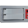 Horno mono-cámara (interior 35×35 cm), alcanza 430ºC en minutos. Mandos analógicos. Posibilidad de superponer 3 hornos. Superficie cocción con ladrillo refractario, parte superior resistencia blindada. Estructura y cámara en acero inoxidable, puerta con cristal, luz interior.