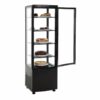 Vitrina pastelera acabada en acero inoxidable. 4 lados de vidrio para exposición de tartas, pasteles y postres. Termostato automático con pantalla digital. Desescarche automático. Estantes cromados. Iluminación interior LED. Ruedas con freno.