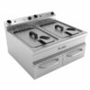 Freidora diseñada en acero inoxidable AISI 304 (18/10). Cuba interior embutida de AISI 304, sin ángulos y con las marcas de máx-mín. del nivel de aceite. Su sistema de agua y aceite permite el ahorro de aceite y no mezcla sabores. Cabezal eléctrico extraíble para facilitar su limpieza. Termostato de trabajo regulable hasta 200ºC/20A. Termostato de seguridad con rearme manual 230ºC/20A. Resistencia blindada en acero inoxidable. Sistema de fijación de la cesta para escurrir el aceite en la cuba. Con grifo incorporado para evacuar el aceite. Sistema elevación manual de la cesta para calentar el volumen de aceite necesario para freír. Cesta reforzada en malla y varilla en acero inoxidable AISI 304 (18/10), según normativa sanitaria. Filtro de residuos en el fondo de la cuba. Contenedor de vaciado extraíble en la parte inferior de la freidora (mod. 17/30) Patas regulables en altura y antideslizantes.