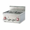 Freidora diseñada en acero inoxidable CrNi 18/10 AISI 304, plano de 1 mm de grosor, satinado superficial Scotch-Brite, detalles cromados y perfiles redondeados. Plano dotado de alzado posterior. Uso profesional, de alta potencia y con una amplia superficie de calor. Con cuba única o doble, tapa y cesto en rejilla de acero cromado brillante, filtro cuba con soporte para cesta (posibilidad de cestos de 1/2 para cuba única). Garantía absoluta de higiene. Encendido automático de llama piloto de los quemadores por medio de piezoeléctrico, válvula termostática y termopar. Descarga frontal del aceite, evacuación de humos posterior, completamente segura.