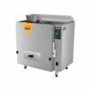 Freidora Fce+Carrousel. Automatización a gran escala. Ritmo inigualable sin necesidad de recargar en cada ración. Su diseño permite disponer de cinco raciones de 500g en cada una, cuatro en el carrusel y una en la cámara de fritura. Gestión múltiple de producto, de manera que se recogerá la vasija llena con la ración recién frita y se desplazara una de las vacías hasta el centro del cajón.