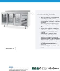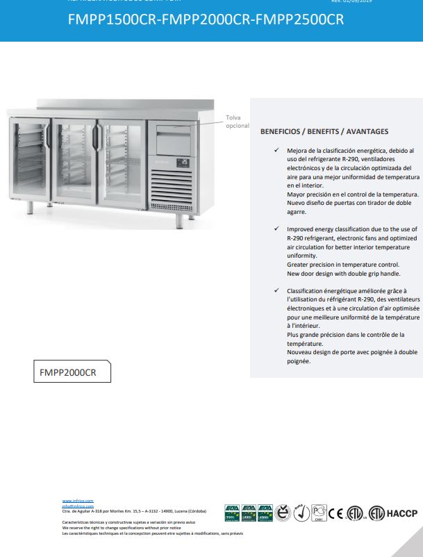 - Opcional (consultar precios): juego de guías; parrilla; parrilla doble tupida; parrilla inoxidable; tolva; cerradura lock; cerradura glass lock; grupo lado contrario; Iluminación LED RGB con cambio de color; Gas R-290 +4%.