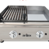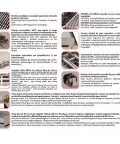 - Placa de asar de 15 mm de espesor. Peto de 100 mm de altura y 3 mm de espesor soldado por la parte superior evitando de este modo la acumulación y filtrado de grasas entre placa y petos. Fabricada en acero con baño de cromo duro de 50 micras.