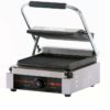 Plancha grill eléctrica con carrocería de acero inoxidable y peto antisalpicaduras. Placa superior e inferior ranurada de hierro fundido, cubiertas con capa antiadherente. Control de temperatura por termostato regulable hasta 300ºC. Pilotos indicadores. Bandeja recogegrasas.