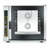 Horno diseñado en acero inoxidable en interior y exterior. Control de temperatura de 50 a 270ºC por sonda digital. Puerto serial para conexión a PC. Dotado de 99 programas y 4 fases programables. Equipado con vapor directo con regulación automática mediante selector con mando de visualización LED de 10 posiciones. Certificaciones IPX3 y CB. Puerta ventilada con vidrio inspeccionable y apertura lateral. Motor ventilador bidireccional. Sistema de refrigeración forzado de los componentes internos. Paso de guías GN1/1 de 68mm y GN2/1 de 80mm. Bisagras de puerta regulables. Cubeta recogida de condensación extraíble (en la puerta). Posibilidad de superposición. Preparado para lavado manual + automático. Preparación para sonda al corazón. Bandejas no incluidas.