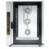 Horno diseñado en acero inoxidable en interior y exterior. Control de temperatura de 50 a 270ºC por sonda digital. Puerto serial para conexión a PC. Dotado de 99 programas y 4 fases programables. Equipado con vapor directo con regulación automática mediante selector con mando de visualización LED de 10 posiciones. Certificaciones IPX3 y CB. Puerta ventilada con vidrio inspeccionable y apertura lateral. Motor ventilador bidireccional. Sistema de refrigeración forzado de los componentes internos. Paso de guías GN1/1 de 68mm y GN2/1 de 80mm. Bisagras de puerta regulables. Cubeta recogida de condensación extraíble (en la puerta). Posibilidad de superposición. Preparado para lavado manual + automático. Preparación para sonda al corazón. Bandejas no incluidas.