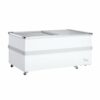 Isla de congelación de gran capacidad con puertas correderas de cristal templado de gran resistencia. Fabricado en chapa de acero lacado blanca en exterior e interior con diseño de cantos redondeados. Escalón en interior de la cuba. Aislamiento de 65 mm de ciclopentano libre de CFC. Desagüe interior que facilita la limpieza y la evacuación de líquidos. Dotación de 4 cestas, cerradura con llave y 4 ruedas con freno. Temperatura ajustable hasta -18ºC. Indicador de energía, encendido y alarma. Categoría climática N-ST. Sistema de enfriamiento estático. Evaporación automática. Condensación ventilada. Gas refrigerante R-134A.
