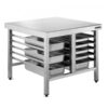 Mesa de trabajo mural con perfil salvaaguas, cubeta central y estante, gama 700.