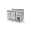 Mesa refrigerada de trers puertas de cristal, fabricación nacional. Exterior e interior en acero AISI-304. Puertas de apertura reversible, con sistema de cierre automático y burlete magnético (permanece abierta al superar los 90° de apertura). Encimera con peto trasero sanitario de 100 mm. Estantes interiores de alambre en acero plastificado, regulables en altura. Pies en tubo de acero inox ajustables en altura 125-200 mm. Unidad condensadora ventilada y extraíble. Evaporador sistema tiro forzado, con recubrimiento anticorrosión. Evaporación automática del agua de descarche. Aislamiento de poliuretano inyectado, densidad 40 Kg/m³, bajo GWP y cero efecto ODP. Control digital de temperatura y descarches, eficiente en la gestión del consumo de energía. Temperatura de trabajo a 32°C ambiente. Luz interior solo en modelos con puertas de cristal.