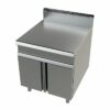 Mueble neutro con estructura construida en acero inoxidable. Plano de trabajo, paneles laterales y traseros y chimeneas fabricados en acero inoxidable AISI-304 18/10 para permitir una mayor durabilidad, robustez, fiabilidad y fácil limpieza. Patas en acero inoxidable regulables en altura, fácilmente sustituibles por ruedas.