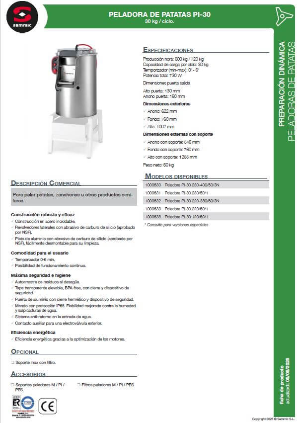 - Equipamiento opcional: soportes y filtros anti-espuma para las peladuras.