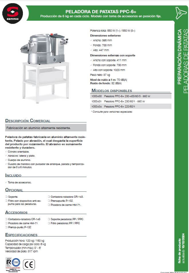 - Equipamiento opcional: soportes y filtros anti-espuma para las peladuras.