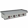 Plancha a gas con diseño en acero inoxidable acabado alto brillo, certificado CE. Placa de asar de 6mm de espesor y peto de 36mm de altura, diseñada en acero laminado con protección antioxidación. Placa de cocción totalmente extraíble. Mandos de baquelita cromado de gran calidad con marcador máximo – mínimo. Grasera frontal de gran capacidad y fácilmente extraíble fabricada totalmente en acero inoxidable. Encendido automático por piezoeléctrico (1 por válvula de gas). Pies altos regulables de gran robustez. Quemador de diseño propio con salida de llama por todo su perímetro asegurando un reparto uniforme de calor por toda la placa. Sin «zonas frías». Gran poder calorífico con termopar de seguridad. Toma de gas por la parte trasera. De serie se suministran predispuestas para gas propano – butano y se proporcionan inyectores para cambios a gas natural.
