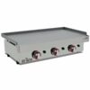 Plancha a gas con diseño en acero inoxidable acabado alto brillo, certificado CE. Placa de asar de 6mm de espesor y peto de 36mm de altura, diseñada en acero laminado con protección antioxidación. Placa de cocción totalmente extraíble. Mandos de baquelita cromado de gran calidad con marcador máximo – mínimo. Grasera frontal de gran capacidad y fácilmente extraíble fabricada totalmente en acero inoxidable. Encendido automático por piezoeléctrico (1 por válvula de gas). Pies altos regulables de gran robustez. Quemador de diseño propio con salida de llama por todo su perímetro asegurando un reparto uniforme de calor por toda la placa. Sin «zonas frías». Gran poder calorífico con termopar de seguridad. Toma de gas por la parte trasera. De serie se suministran predispuestas para gas propano – butano y se proporcionan inyectores para cambios a gas natural.