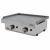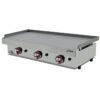 Plancha a gas con diseño en acero inoxidable acabado alto brillo, certificado CE. Placa de asar de 6mm de espesor y peto de 36mm de altura, diseñada en acero laminado con protección antioxidación. Placa de cocción totalmente extraíble. Mandos de baquelita cromado de gran calidad con marcador máximo – mínimo. Grasera frontal de gran capacidad y fácilmente extraíble fabricada totalmente en acero inoxidable. Encendido automático por piezoeléctrico (1 por válvula de gas). Pies altos regulables de gran robustez. Quemador de diseño propio con salida de llama por todo su perímetro asegurando un reparto uniforme de calor por toda la placa. Sin «zonas frías». Gran poder calorífico con termopar de seguridad. Toma de gas por la parte trasera. De serie se suministran predispuestas para gas propano – butano y se proporcionan inyectores para cambios a gas natural.