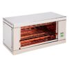 Tostador diseñado en acero inoxidable acabado alto brillo. Resistencias en tubos de cuarzo con terminales reforzados en los extremos. Equipado con temporizador de 15 minutos. Interruptores luminosos para funcionamiento de resistencias por niveles. Parrillas extraíbles sobre guías. Cajón recogemigas.