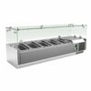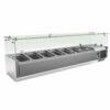 Modelo PEKIN VRX1400330FG. Vitrina de ingredientes con cúpula de vidrio; 6 cubetas GN1/4; Temperatura 2/8ºC; 260W. Medidas: 140 x 33.5 x 44 cm.