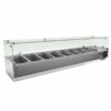 Modelo PEKIN VRX1800380FG. Vitrina de ingredientes con cúpula de vidrio; 8 cubetas GN1/3-150; Temperatura 2/8ºC; 260W. Medidas: 180 x 38 x 44 cm.